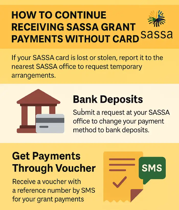 If your SASSA card is lost or stolen, you can still continue receiving your grant payments in alternative ways, such as bank deposits, ATM withdrawals, Post Office, and affiliated payment points (Pick n Pay, Boxer).